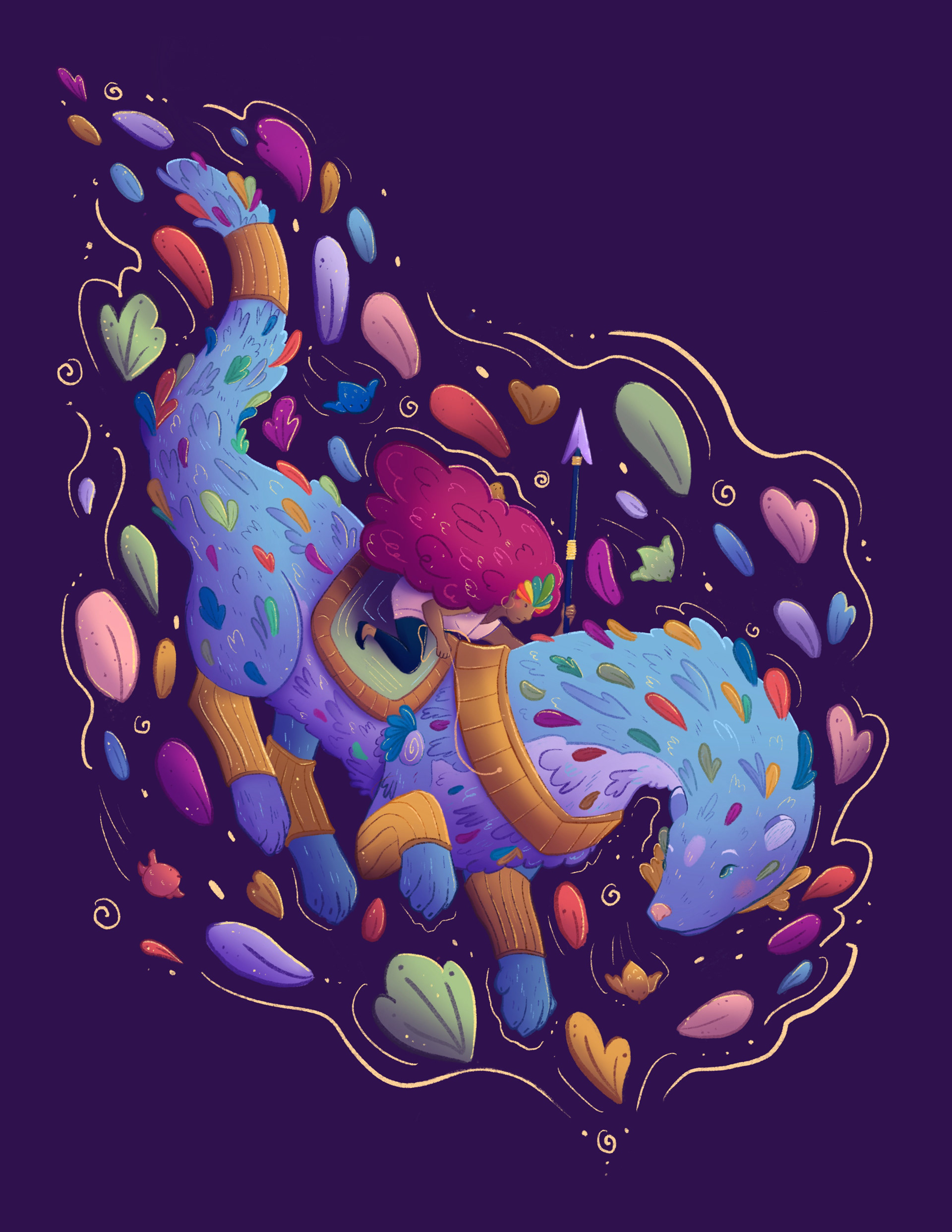 A whimsical illustration of a strong rider and her blue weasel companion.